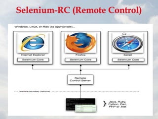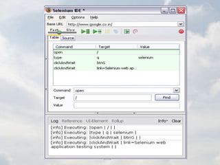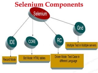 This document provides information on Selenium, an open source automated testing framework for web applications. It discusses that Selenium provides record and playback functionality to author tests without coding, supports various programming languages, and works across browsers and platforms. The document also summarizes Selenium IDE, Selenium RC, and Selenium Grid.