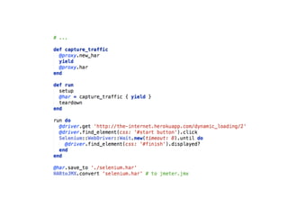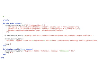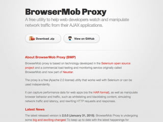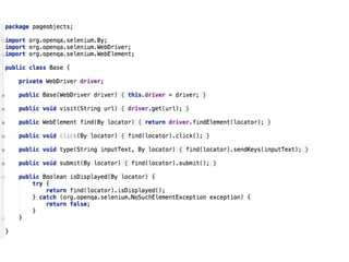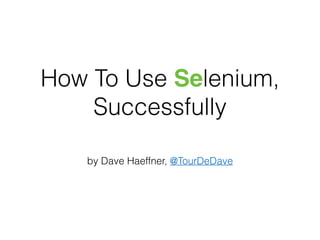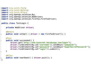 The document provides tips and strategies for using Selenium to write automated tests. It begins with an overview of Selenium and outlines a 10 step process to write successful tests. The steps include defining a test strategy, choosing a programming language, learning Selenium fundamentals, writing the first test, implementing page objects for maintainable code, making tests resilient to failures, adding cross-browser testing, creating an automated feedback loop through continuous integration, and finding additional information resources. The document emphasizes writing reusable, maintainable and resilient tests that can run across browsers to test an application.
