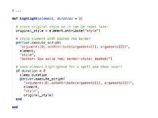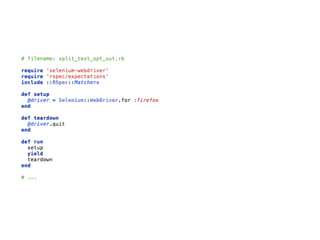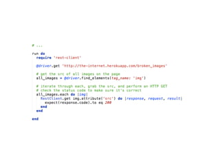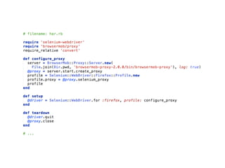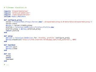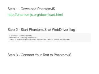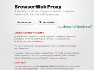 This document provides tips and tricks for using Selenium. It discusses using headless browsers like PhantomJS to speed up test execution. It also covers visual testing, using a proxy server to manipulate requests, and workarounds for actions like uploading files and downloading secure files without the browser dialog. Additional resources are provided for getting started with Selenium Grid and for subscribing to weekly Selenium tips.