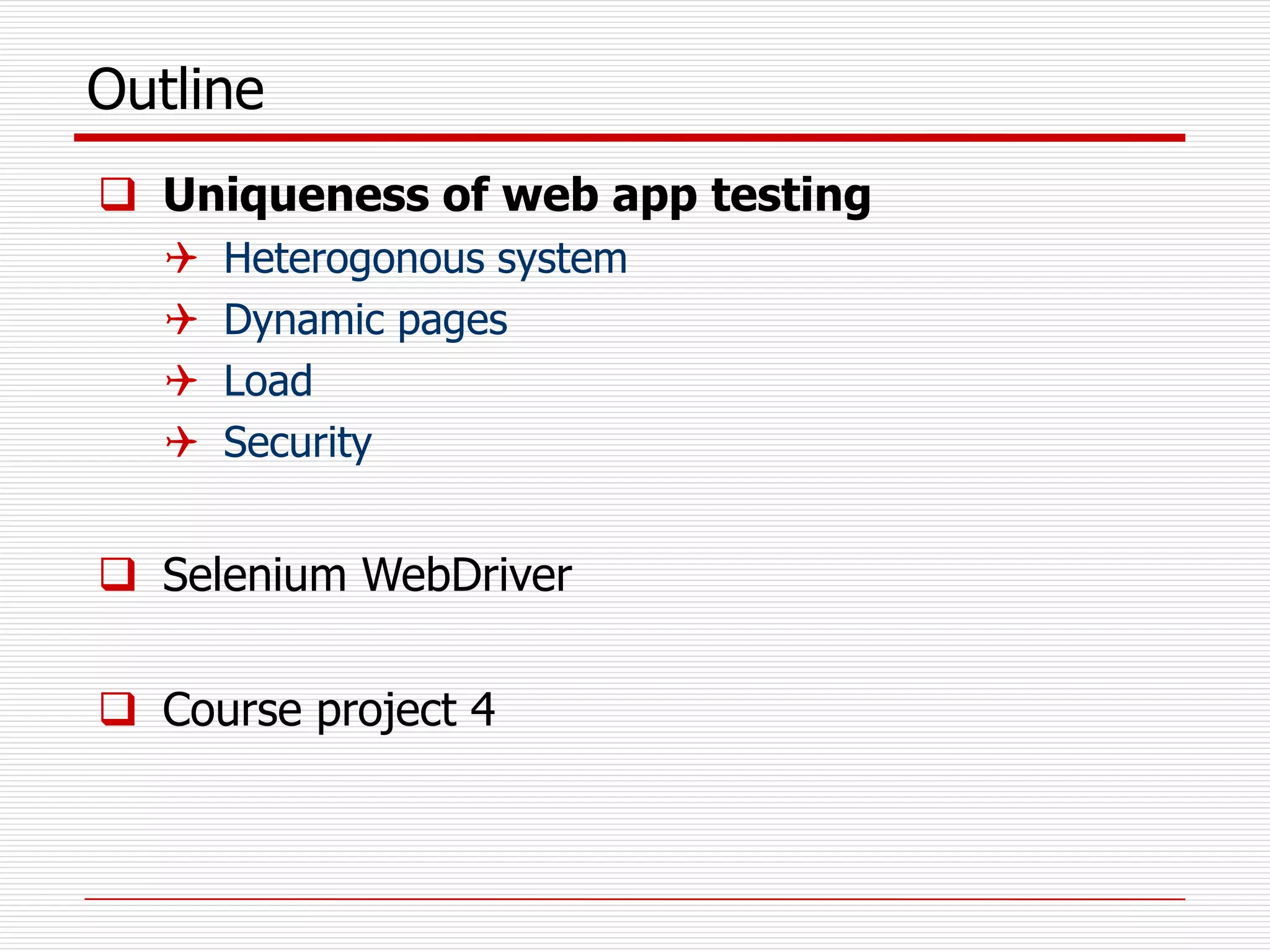 This document discusses testing web applications using Selenium. It begins by outlining some unique aspects of web application testing, including that web apps have heterogeneous systems with dynamic pages, need to consider load and security testing. It then discusses using Selenium IDE for easy recording and playback of tests in Firefox, and Selenium WebDriver for more flexible testing across browsers. The document concludes by outlining a course project to test a school scheduling application without access to source code, including designing test cases based on requirements and implementing WebDriver scripts.