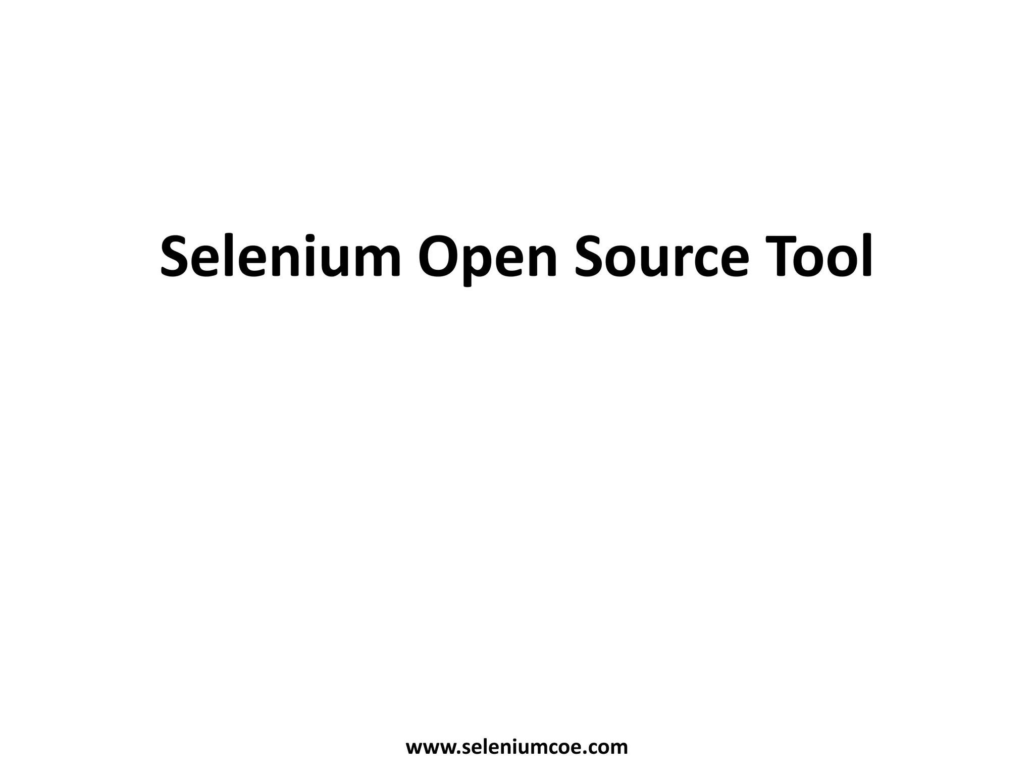 Selenium is an open-source JavaScript framework used for testing web applications by simulating user interactions and validating page elements across various programming languages. Users can easily record and playback test cases using the Selenium IDE plug-in for Firefox, which provides commands for creating tests and logging results. The document also outlines the creation and execution of test suites, emphasizing that Selenium Core must be deployed on the same server as the application under test.