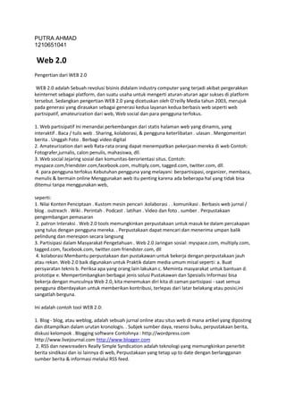 Web 2.0 merupakan evolusi dari website yang menekankan partisipasi pengguna, interaktivitas, dan komunitas berbasis sosial, yang diperkenalkan oleh O'Reilly Media pada tahun 2003. Fitur-fitur utama Web 2.0 meliputi blogging, media sosial, kolaborasi, dan berbagi konten, sementara berbagai alat dan platform seperti YouTube, Flickr, dan wiki mendukung pengalaman ini. Pengguna Web 2.0 kini diberdayakan untuk berkontribusi dan terlibat dalam percakapan online, menciptakan ekosistem informasi yang dinamis dan kolaboratif.