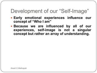 The document discusses several theories of self-awareness and self-development, including how early experiences shape one's self-image, the influence of significant others, social comparison processes, Freud's concepts of the id, ego and superego, Erikson's psychosocial stages of development, and Rogers' notion of unconditional positive regard and the real self. It also provides tips for improving self-esteem such as recognizing one's control over self-image, affirming strengths, and maintaining a sense of humor.