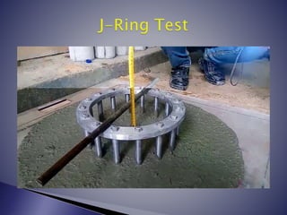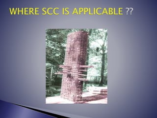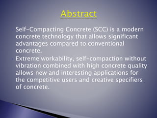 Self-compacting concrete (SCC) is a highly fluid concrete that can flow and consolidate under its own weight without vibration. It was developed in Japan in the 1980s in response to a shortage of skilled labor. SCC mixtures have more powder and less coarse aggregate than conventional concrete, and include high-range water reducers and viscosity modifying agents. SCC allows for easier placement, improved surface finish, and greater design freedom.