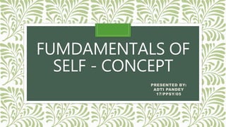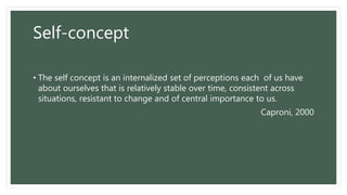 This document discusses the fundamentals of self-concept. It defines self-concept as an internalized set of perceptions about oneself that is relatively stable over time. Self-concept develops throughout life and is influenced by factors such as development level, beliefs, experiences, culture, and success/failures. It has several components including personal identity, body image, self-esteem, and role performance. Self-concept influences how people perceive themselves and make decisions.