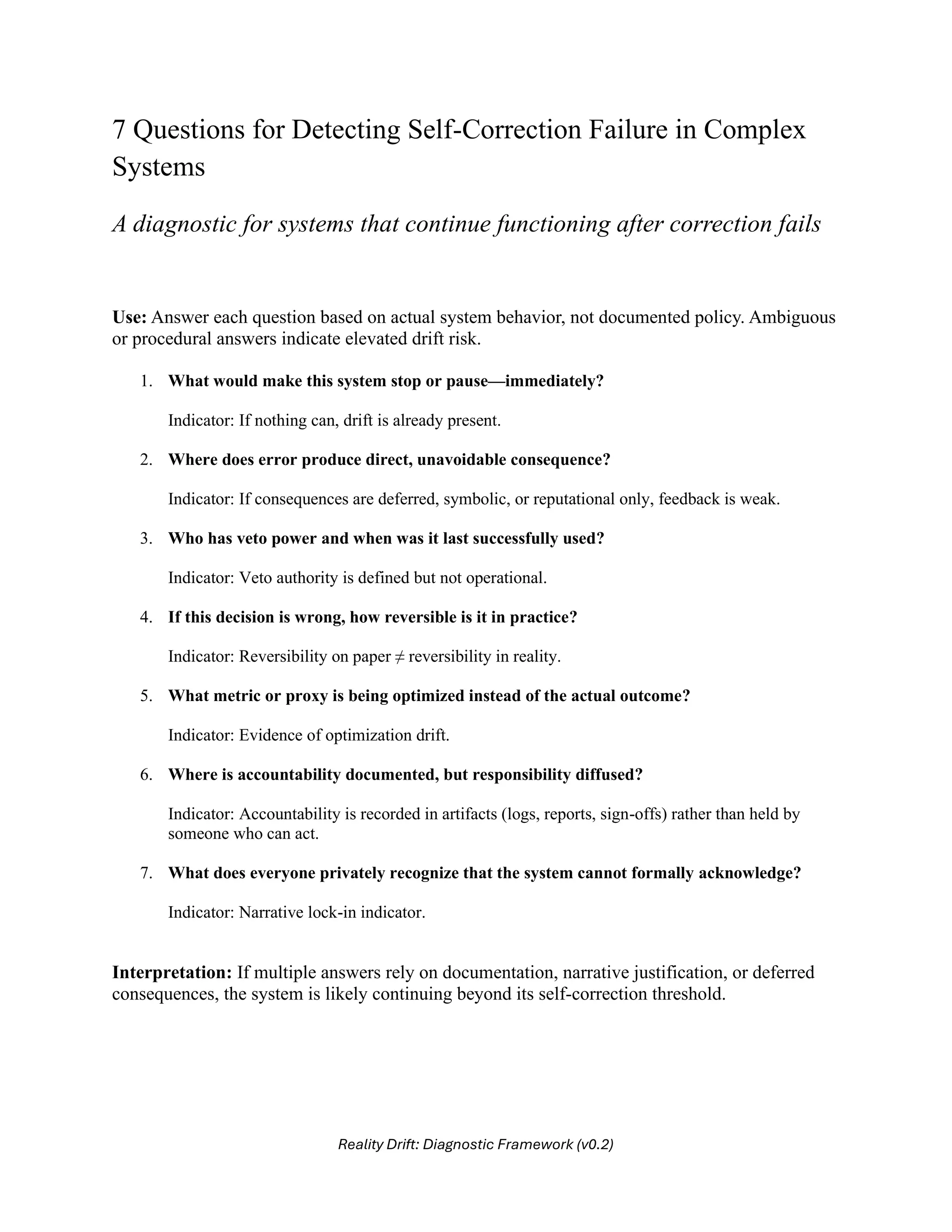 A concise diagnostic framework for identifying self-correction failure in complex systems. Presents operational questions and indicators for detecting constraint collapse, feedback inversion, optimization drift, and governance breakdown. Intended for use in UX research, AI safety reviews, system post-mortems, risk assessment, and organizational learning.