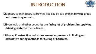 The document presents a detailed overview of self-curing concrete, highlighting its importance in modern construction, especially in water-scarce regions. It discusses the definition, methods, and advantages of self-curing concrete, emphasizing its ability to retain moisture through chemical compounds or admixtures. Experimental results demonstrate improved strength characteristics of self-curing concrete compared to conventional methods, making it a viable solution for efficient concrete curing.