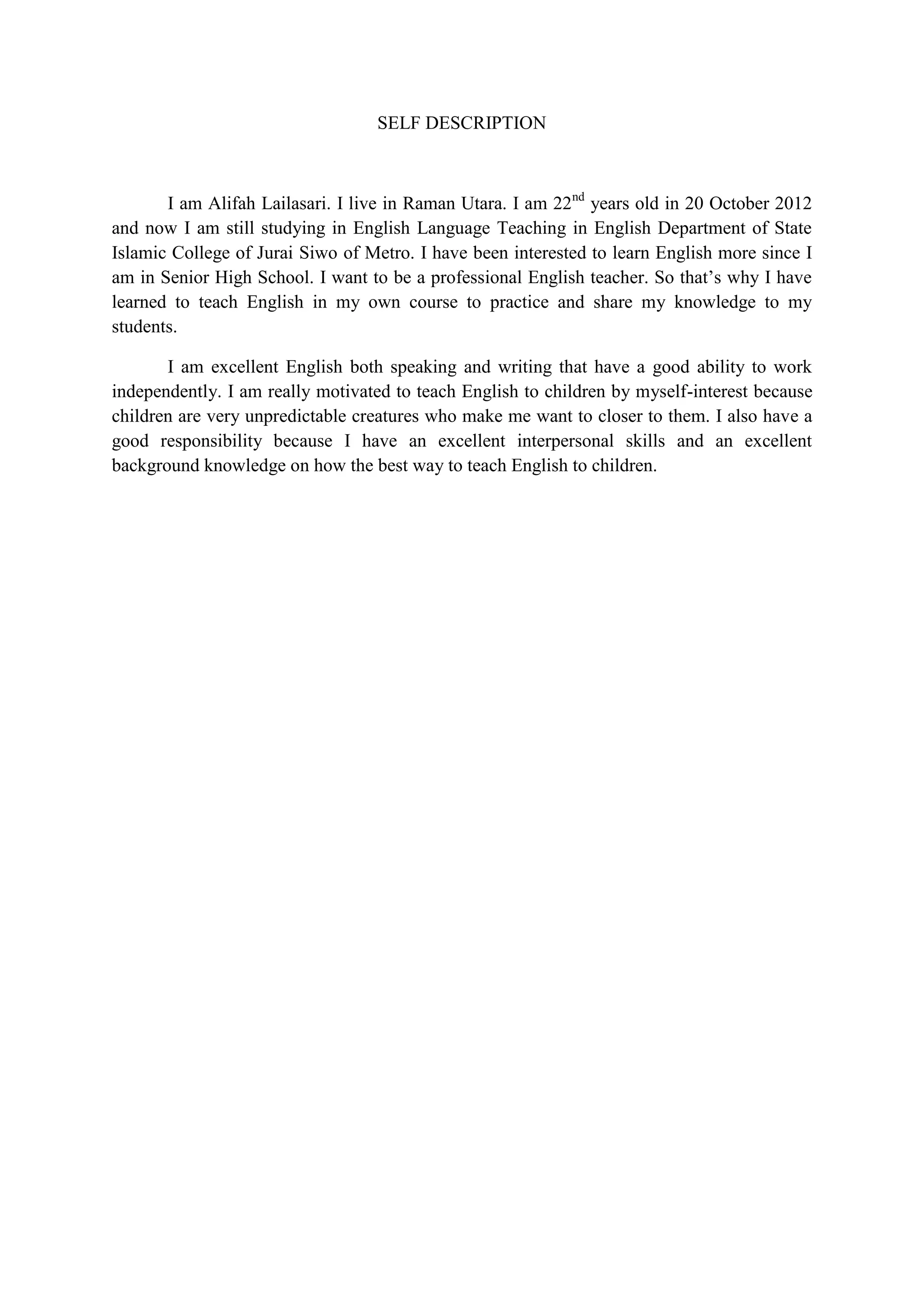 I am Alifah Lailasari, a 22-year-old English student from Raman Utara studying at the State Islamic College of Jurai Siwo of Metro. She has been interested in learning English since high school and wants to become a professional English teacher. She is studying to teach English and practices by teaching her own courses to share her knowledge with students.
