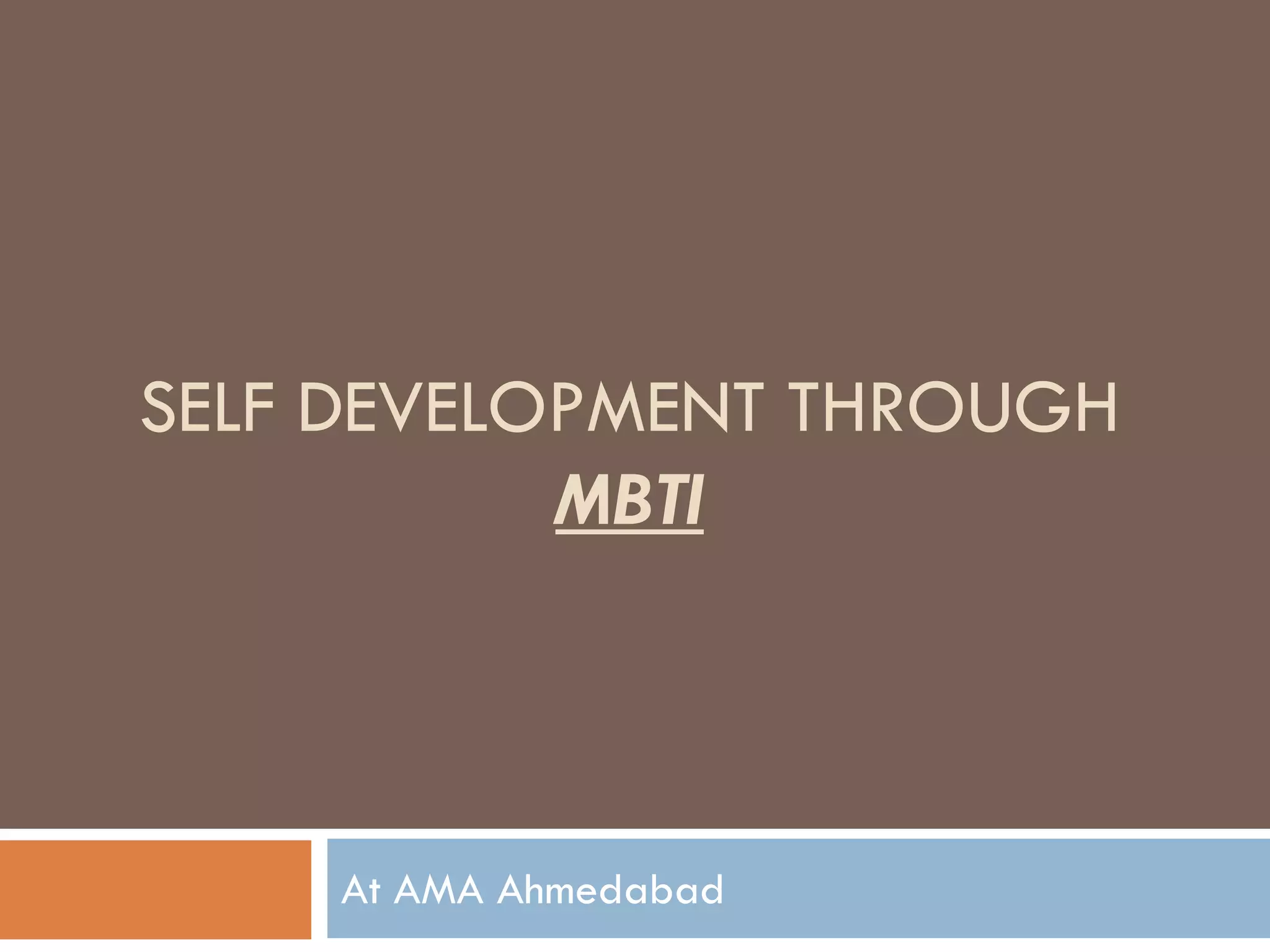 This document provides an overview of self-development training offered by AMA Ahmedabad focused on personality types and management skills. The training covers MBTI personality types, transactional analysis models, mentalities and life positions, people performance management tips, team bonding processes, and communication strategies. It also outlines the 16 personality preferences individuals are born with related to extraversion/introversion, sensing/intuition, thinking/feeling, and judging/perceiving. The goal is to help participants improve self-awareness, people skills, decision making, and ability to organize their external world.