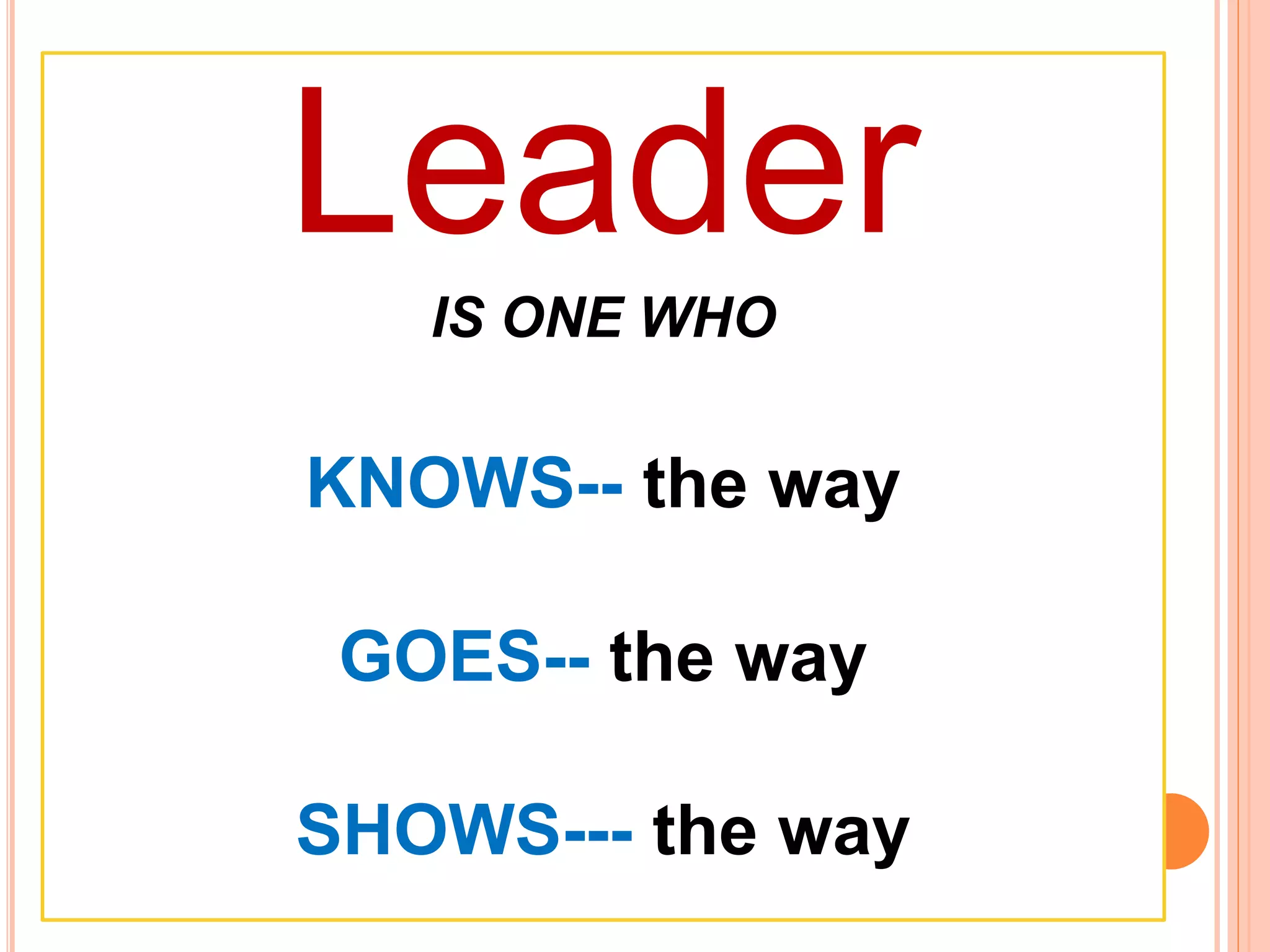 1. A leader knows the way, goes the way, and shows the way.