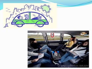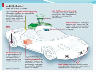 This document discusses self-driving cars, including what they are, how they work, potential advantages and disadvantages, and challenges. It defines a self-driving car as a vehicle that can travel from place to place without human interaction by using sensors to navigate autonomously. Some advantages mentioned are increased road capacity, faster reaction times leading to fewer accidents, and reduced pollution. Disadvantages include high costs, potential software failures, and issues with public acceptance. Challenges involve gaining trust from humans, ensuring computer security, addressing legal liability, and requiring regulation from transportation safety authorities.