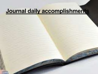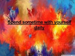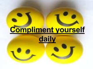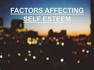 This document discusses self-esteem and provides information on types of self-esteem and tips for improving self-esteem. It defines self-esteem as a person's overall subjective emotional evaluation and judgment of their own worth. There are three main types of self-esteem discussed: high self-esteem, low self-esteem, and inflated self-esteem. Tips for improving self-esteem include stopping negative thoughts, focusing on accomplishments rather than perfection, viewing mistakes as learning opportunities, and prioritizing self-care. The conclusion emphasizes that an individual has the most control over their own self-esteem.