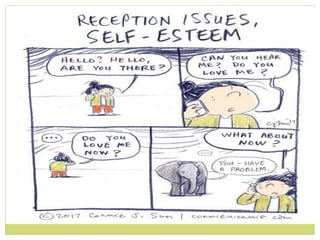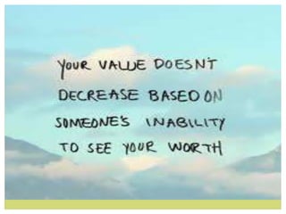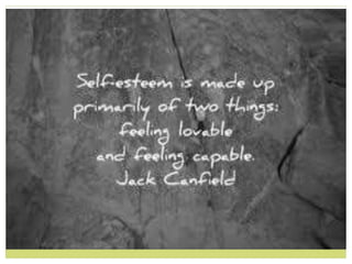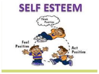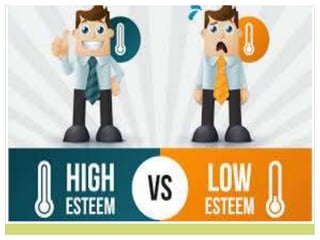 The document discusses the concept of self-esteem, highlighting how it is influenced by self-assessment and perceptions from others, which can be positive or negative. It outlines the qualities associated with high and low self-esteem and provides steps to improve one's self-esteem, such as nurturing oneself, setting goals, and accepting oneself. Additionally, it emphasizes that strong self-esteem allows individuals to recognize their value, strengthen relationships, and overcome challenges.