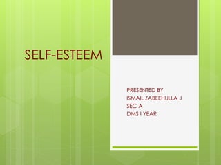 The document discusses self-esteem, defining it as how individuals perceive their worth and feelings of self-competence. It outlines characteristics of both high and low self-esteem, factors that influence it, and strategies for enhancement, such as positive self-talk, setting goals, and accepting oneself. The importance of personal aspirations, feedback, and social environment in shaping self-esteem is also emphasized.