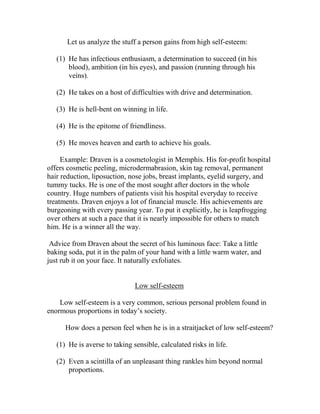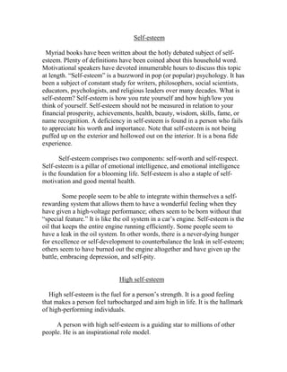 The document discusses the topic of self-esteem, including: