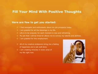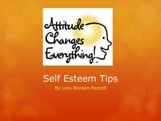 This document provides tips for improving self-esteem, including filling your mind with positive thoughts through affirmations and visualization. It recommends acting confidently, avoiding criticism, practicing gratitude, and reframing negative experiences in a positive light. When feeling depressed, the document suggests accepting reality while focusing on positive activities, thoughts, and social support.