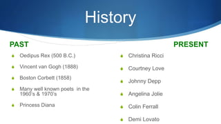 This document provides an overview of non-suicidal self harm (NSSI), including its history, definitions, common forms, signs to look for, potential causes, and treatment approaches. NSSI is defined as deliberate tissue damage without suicidal intent and is commonly practiced through cutting, burning, scratching, and other means. Theories suggest it is used as an affect regulation strategy. Resources for help are also listed.