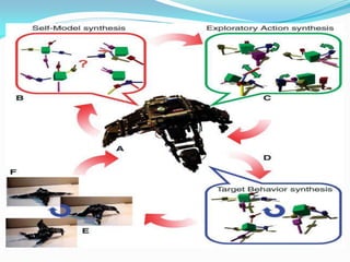 This document describes an experiment on a quadrapedal robot designed for self-healing capabilities. The robot consists of a body with four legs, each with two joints, and is equipped with sensors and actuated by servomotors. The robot uses an internal neural network model to autonomously synthesize predictive models of its own structure. The experiment involves introducing damage scenarios to test the robot's ability to recover through self-modeling, exploratory action, and adapting its target behavior based on its new configuration. The robot is able to detect changes to its morphology and continually update its internal model through exploration and hypothesis testing to compensate for damage.