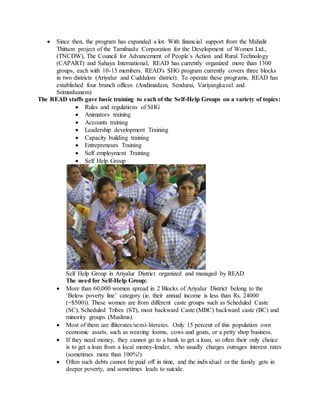 Self-help groups (SHGs) are groups of 10-20 local women or men that come together for financial services. SHGs are very common in India and other parts of Asia. There are different models for how SHGs are linked to financial institutions in India, with the most popular being where NGOs help form SHGs that are then financed by banks. SHGs aim to organize and empower women, promote savings, and improve socioeconomic status by providing access to loans and resources. One example is an SHG in India called READ that formed over 1300 groups covering two districts to help over 60,000 impoverished women gain financial independence through collective savings and small loans.