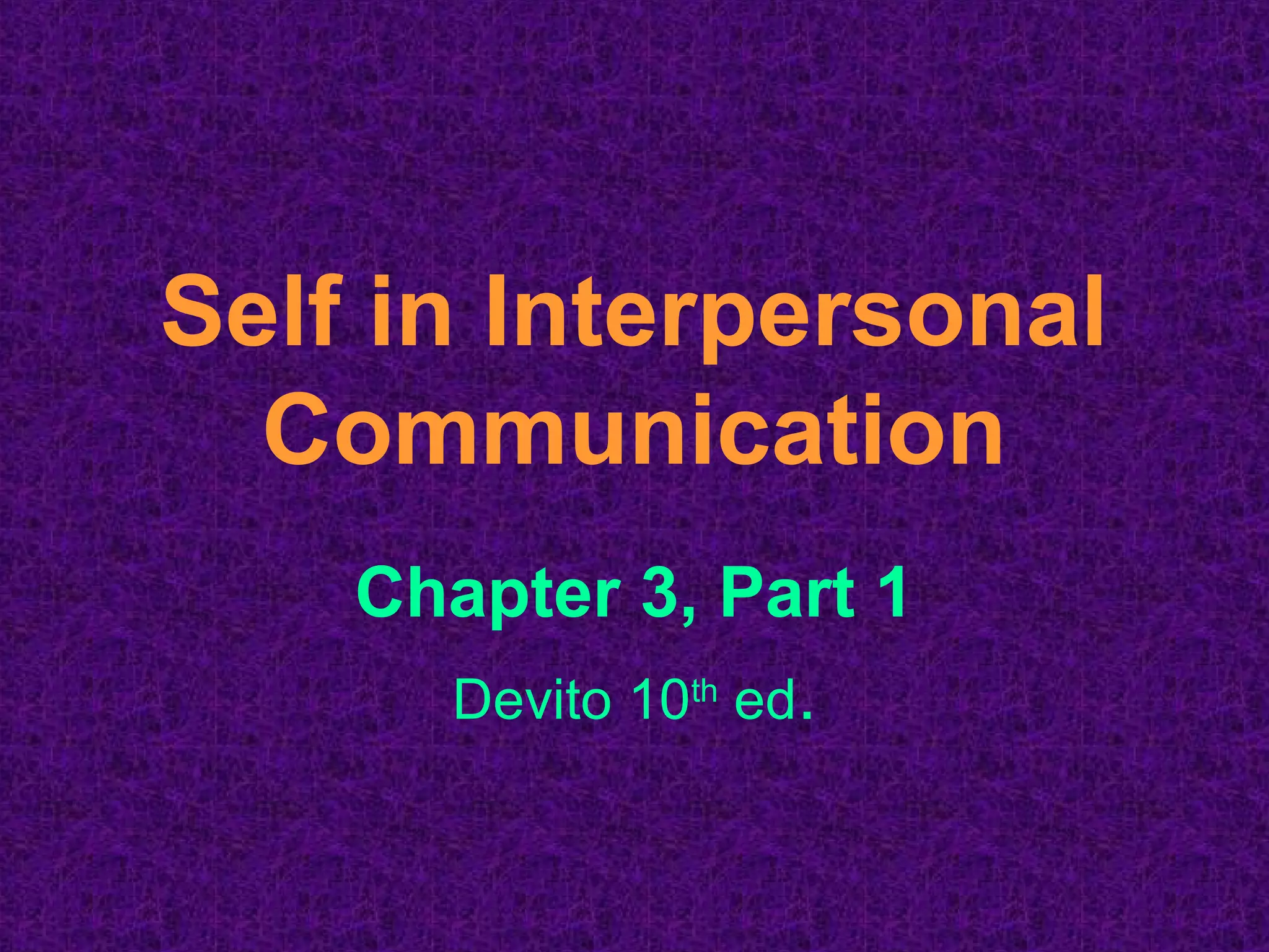 This chapter discusses the concept of self and interpersonal communication. It defines self-concept as how one views themselves and how that develops through others' perceptions, social comparisons, and cultural teachings. The self-concept influences communication and is multidimensional, subjective, resistant to change but flexible if healthy. Cultural influences and communication apprehension also impact one's self-concept. Guidelines are provided for appropriate self-disclosure and responding supportively to others' disclosures in order to have effective interpersonal communication.