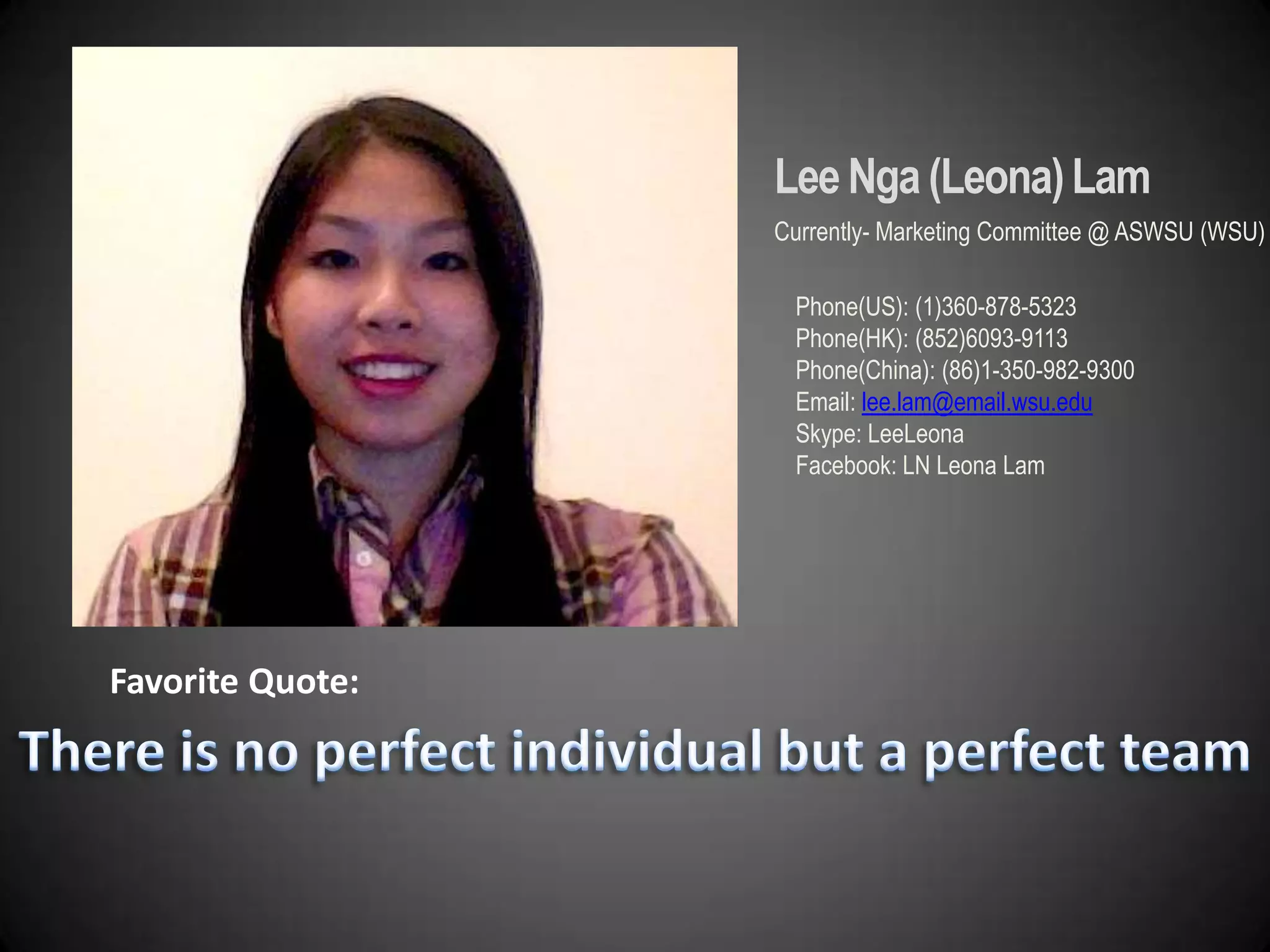 Lee Nga (Leona) Lam is currently on the Marketing Committee at ASWSU at WSU. She provides her contact information including phone numbers for the US, Hong Kong, and China as well as her email and Skype. Her background includes being an international student from Hong Kong studying International Business at WSU. She is trilingual and her focuses include culture differences in Asian countries and Confucianism. Her employment experience includes working at Panda Express and a jewelry shop. Her student involvement includes roles on the Marketing Committee, International Students' Council, and volunteering with various student associations. Her interests include sports, outdoor activities, and drawing. Her goals are to establish a training company in Hong Kong and provide