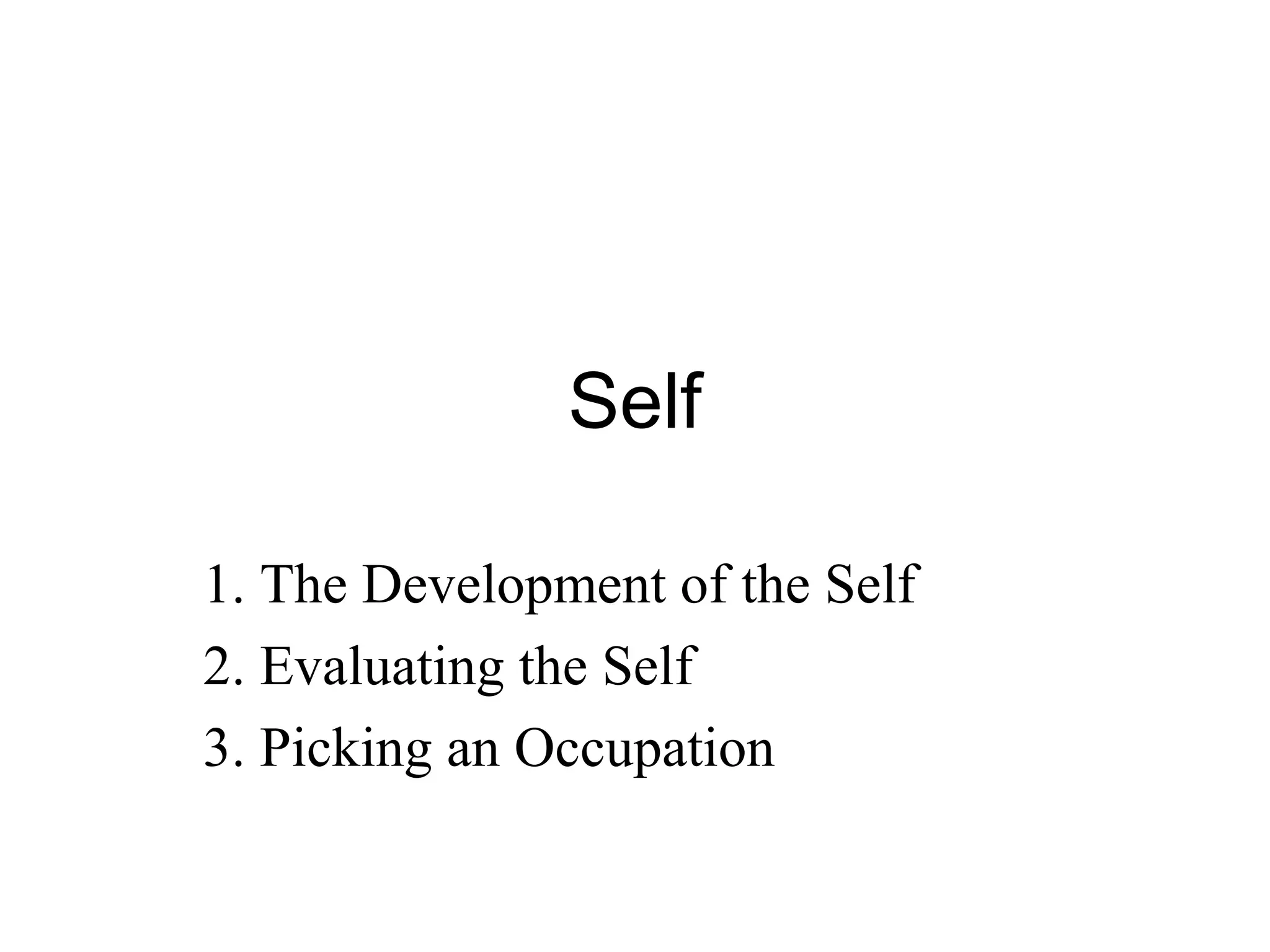 This document discusses the development of self from infancy through adulthood. It covers how self-awareness emerges around 17-24 months as infants begin to recognize themselves in mirrors. Culture influences when self-recognition occurs. During childhood, self-concept is formed based on physical and academic attributes, and adolescents struggle with developing identity. Adulthood brings changes to self-concept through life experiences like marriage and career. Work plays a role in adult identity and self-esteem is influenced by social comparisons and evaluations of how one measures up to standards and peers.