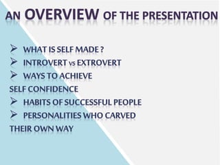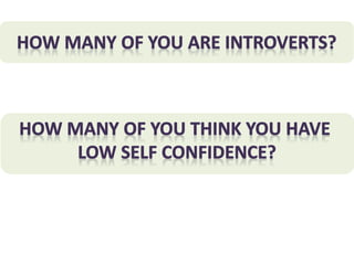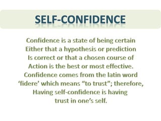 The document outlines strategies to boost self-confidence, including visualization, self-affirmation, facing fears, and questioning one's inner critic. It also highlights seven habits of successful people, such as organization, relaxation, taking action, personal care, maintaining a positive attitude, networking, and rising early. These methods collectively improve personal growth and confidence.