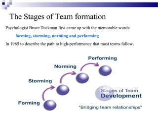 A team is defined as a small group of people with complementary skills who are committed to a common purpose, goals, and approach for which they are mutually accountable. The stages of team formation are forming, storming, norming, and performing. At Google in India, there are self-managed teams because Google believes this allows people to work better. Self-managed teams are independent and self-regulating, defining their own goals and operating with few external controls. Advantages of self-managed teams include flexibility, efficient operations, lower absenteeism, high commitment, minimum supervision, improved productivity, and less wastage. Disadvantages can include extended time to plan, high investment in skills, early inefficiencies due to