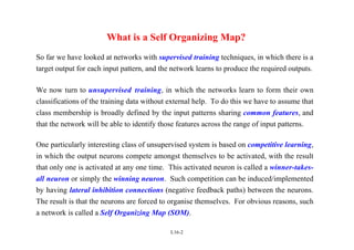 Self Organizing Maps (SOMs) are a type of neural network that uses unsupervised learning to map high-dimensional input data to a low-dimensional discrete map. SOMs learn the topological relationships in the training data and organize themselves through competition between neurons to become selectively tuned to different input patterns. The algorithm involves initializing weights, finding a winning neuron for each input, and updating the weights of the winning neuron and its neighbors to more closely match the input. Repeated iterations of this process cause the neurons to self-organize the input space onto the map in a topologically ordered fashion.