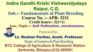 This document discusses self-pollination in plants. It defines self-pollination as the transfer of pollen grains from the anther to the stigma of the same flower or a different flower on the same plant. There are two types of self-pollination: autogamy, where the pollen is transferred to the stigma of the same flower; and geitonogamy, where the pollen is transferred between different flowers on the same plant. Autogamy occurs through homogamy and cleistogamy and has the advantages of not depending on external pollinators and ensuring genetic purity, but has the disadvantages of not producing variation and weaker progeny.