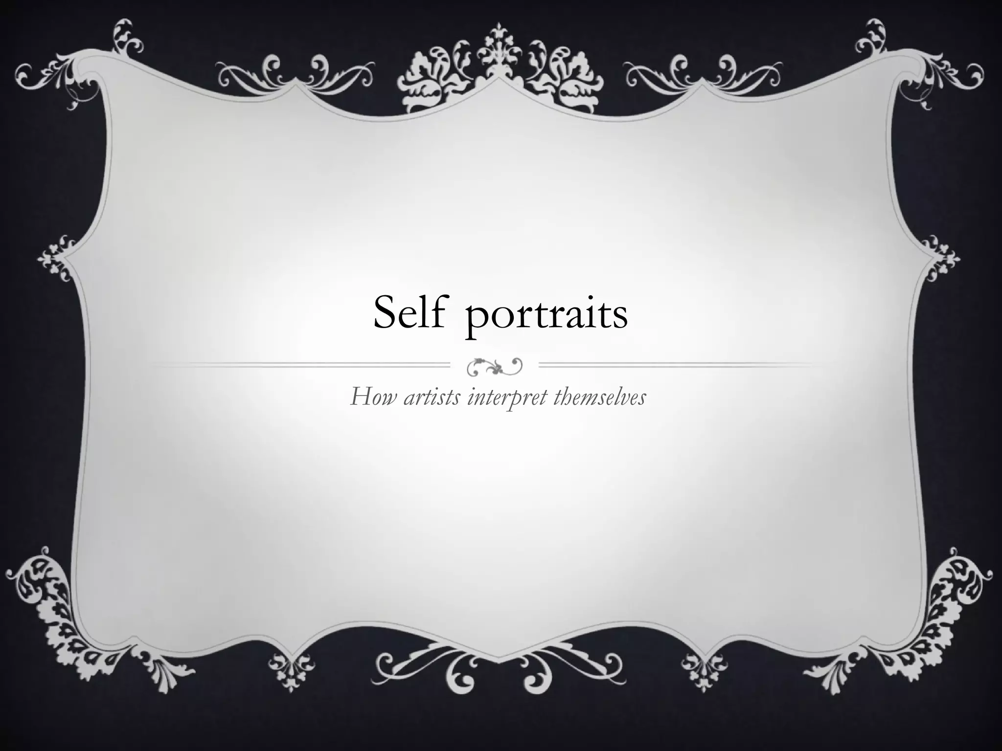 The document discusses self-portraits created by several artists including Van Gogh, Gauguin, and Andy Warhol. It analyzes the artists' use of color, brushstrokes, symbols and style to convey something about their character and how they viewed themselves. The document asks readers to examine details in the self-portraits and make inferences about what the artists were expressing through their artistic interpretations of self-portraits.