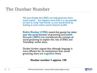 The document discusses the meaning and nature of friendship in social networks. It notes that while social media networks allow people to connect with many others, research suggests there are cognitive limits to the number of close relationships people can maintain. Additionally, not all connections on social media can be considered real friendships. The document explores how social media has changed social behaviors like social grooming and signaling identity. It questions whether long lists of social media connections accurately represent people's real social networks and relationships.