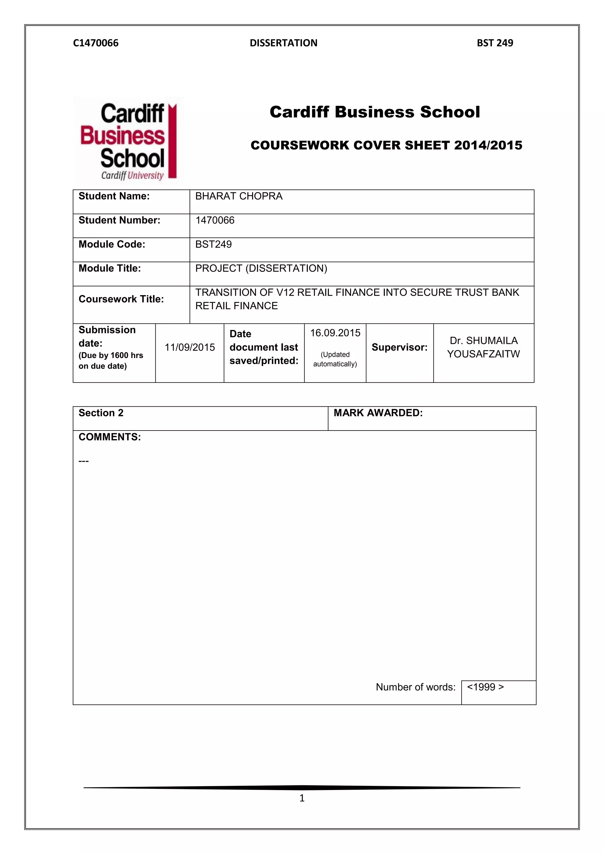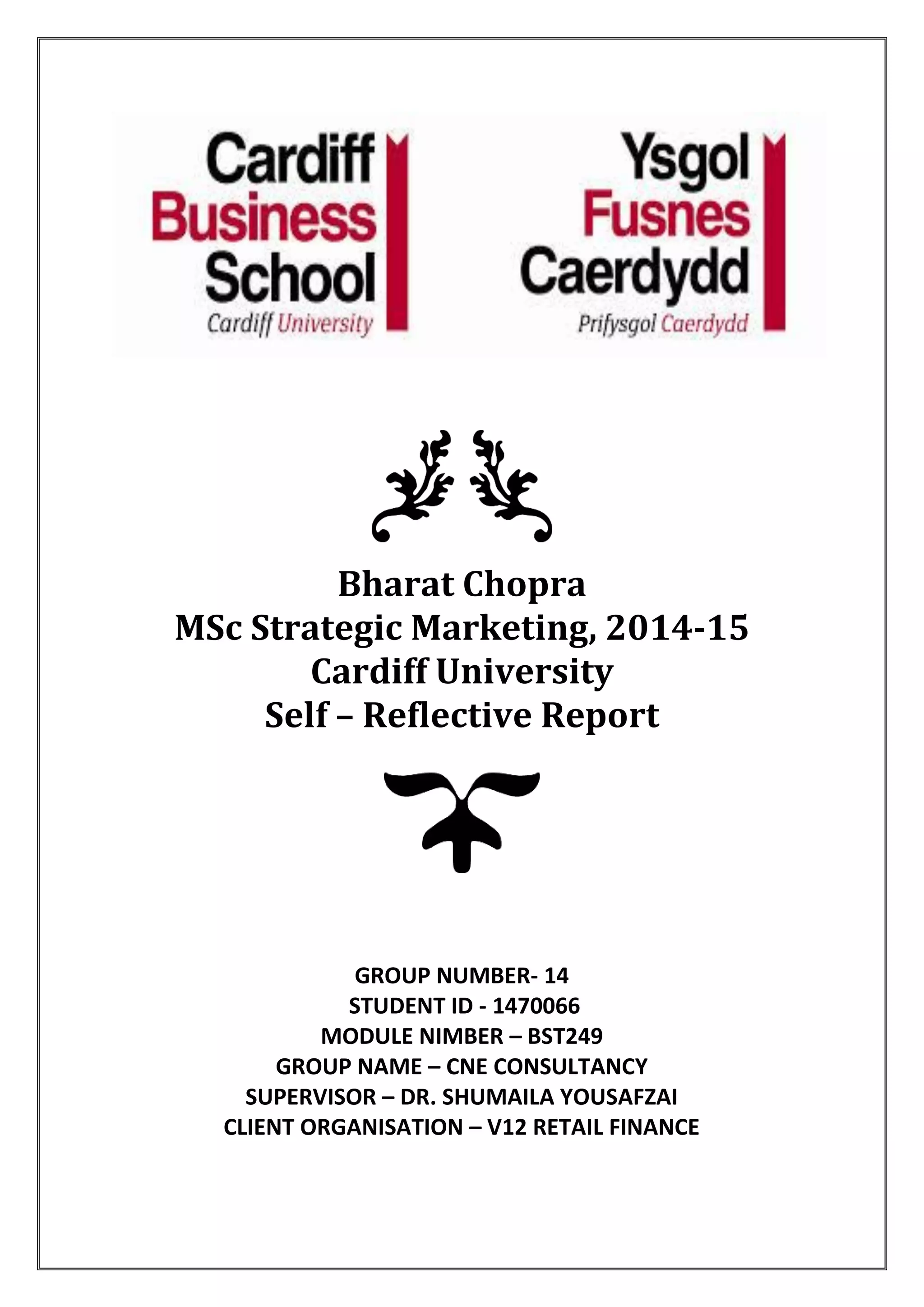 This document is a self-reflective report submitted by Bharat Chopra, a student at Cardiff University, for a group marketing project. The report summarizes the group's roles and experience working together on developing a marketing plan to help with the rebranding transition of their client organization, V12 Retail Finance, to Secure Trust Bank Retail Finance. It describes the group's leadership styles, strategies used in their action plan like Porter's Five Forces analysis, and Bharat's personal growth experiences working on the project.