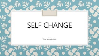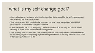 The document discusses a self-change project focused on improving time management skills. It describes the author's history of procrastination and lack of organization. The author's plan was to start writing down all tasks, using calendars and reminders. Over three weeks of logging assignments, the author saw progress including higher confidence, motivation, and completing more work than normal in less time. Consequences for not finishing work and rewards for completing it helped drive progress. In the end, the author gained structure, goals, and self-confidence in their ability to achieve goals through improved time management.