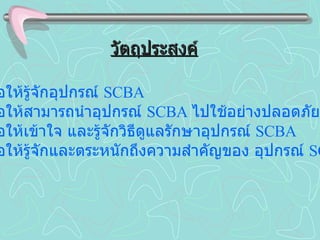Self-Contained Breathing Apparatus 1. S elf- C ontained B reathing A pparatus เครื่องช่วยหายใจแบบอากาศอัด 2. วัตถุประสงค์ เพื่อให้รู้จักอุปกรณ์ SCBA เพื่อให้สามารถนำอุปกรณ์ SCBA ไปใช้อย่างปลอดภัย เพื่อให้เข้าใจ และรู้จักวิธีดูแลรักษาอุปกรณ์ SCBA เพื่อให้รู้จักและตระหนักถึงความสำคัญของ อุปกรณ์ SCBA 3. หัวข้อการอบรม การทำงานของ SCBA การบำรุงดูแลรักษา การตรวจสอบ และการทำความสะอาด การเปลี่ยนถังอากาศ ขั้นตอนปฏิบัติ เมื่อเกิดเหตุฉุกเฉิน เทคนิคการควบคุมการหายใจ ขั้นตอนการสวมใส SCBA 4. 5. SCBA Components Cylinder ( ถังอากาศอัด ) Back Pack ( ชุดประคองหลัง ) Low pressure warning device ( อุปกรณ์เตือนเมื่ออากาศมีแรงดันต่ำ Lung Demand Valve(LDV) ( อุปกรณ์จ่ายอากาศ ) Full Face Mask ( หน้ากากสำหรับหายใจ ) 6. Cylinder ( ถังอากาศอัด ) ชนิดของถังอากาศอัด ถังเหล็ก ถังโลหะผสม ถัง Carbon Fiber ถัง Plastic Fiber 7. Cylinder ( ถังอากาศอัด ) เวลาการใช้งาน Example: for 4 liter/300 bar cylinder Total air capacity = Cylinder capacity x Cylinder pressure = 4 x 300 = 1200 liters of air Total duration of = Total air capacity / Average consumption cylinder = 1200 / 40 = 30 mins Working Duration = Total duration - Safety factor = 30 mins - 10 mins = 20 mins 8. Total air capacity = Cylinder capacity x Cylinder pressure = x = liters of air Total duration of = Total air capacity / Average consumption cylinder = / = mins Working Duration = Total duration - Safety factor = mins - 10 mins = mins Cylinder ( ถังอากาศอัด ) เวลาการใช้งาน Example: for 6.0 liter/ 300 bar cylinder 6.0 300 1,800 1,800 40 45 45 35 9. Cylinder ( ถังอากาศอัด ) Pressure Gauge and Valve Pressure Gauge Open Cylinder Valve Male thread 10. 11. 12. Low Pressure Warning Device อุปกรณ์เตือนเมื่อแรงดันอากาศต่ำ เป็นอุปกรณ์ลดแรงอากาศ จะทำงานร่วมกับระบบเตือนด้วยเสียง (Audible Alarm) จะทำงานเมื่อ แรงดันอากาศเหลือประมาณ 50 bar 13. 14. 15. 16. Maintenance & Inspection หลังการใช้งาน - ต้องเติมอากาศให้เต็ม - ตรวจสอบ O ring - ตรวจสอบและทำความสะอาดหน้ากาก - ตรวจสอบและทำความสะอาด Harness - ตรวจสอบ Gauge และ Valve ต่างๆ 17. Maintenance & Inspection ตรวจสอบทุกเดือน - Visual Check - Valve ของถังอากาศ - สวมใส่ เพื่อตรวจสอบ การไหลของอากาศ เสียงเตือน Pressure gauge ,Exhalation Valve ,Etc. 18. Donning ( การสวมใส่ SCBA ) Doffing Pre-Donning Donning 19. 20. 21. เหตุผลที่ต้องใช้งาน SCBA ปริมาณ ออกซิเจนต่ำกว่า 19.5% อุณหภูมิ ความร้อนรอบข้างสูง สารระคายเคือง ที่มีผลต่อระบบทางเดินหายใจ มีกลุ่มควันหนาทึบ มีก๊าซพิษ e.g. H 2 S, CO 22.