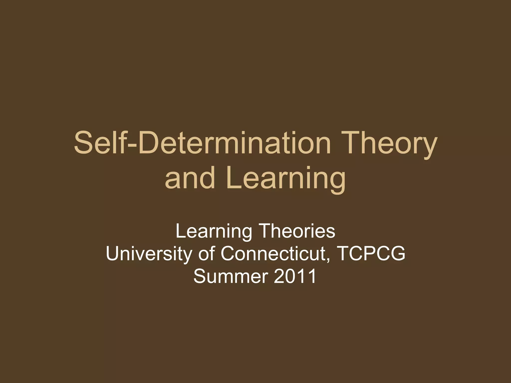 Self-Determination Theory is a framework for studying human motivation and personality with a focus on extrinsic motivation from external rewards and opinions versus intrinsic motivation from internal interests and values. The theory posits that social and cultural factors can either support or undermine people's sense of autonomy, competence, and relatedness, which enhances performance, persistence, and creativity when satisfied, but leads to ill-being and poor functioning when thwarted. The document discusses applying self-determination theory to learning and provides examples of fostering autonomy, competence, and relatedness in educational contexts.