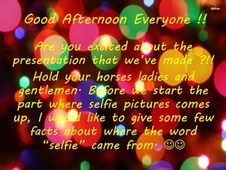 The document summarizes a student presentation about the word "selfie" and introduces members of a group. It explains that the term "selfie" originated from an Australian man in 2002 and was named word of the year by Oxford Dictionary in 2013. It then shows photos of six students with brief descriptions of each, apologizing that there are only a few photos due to members preferring to share from Facebook. It concludes by crediting the students featured.