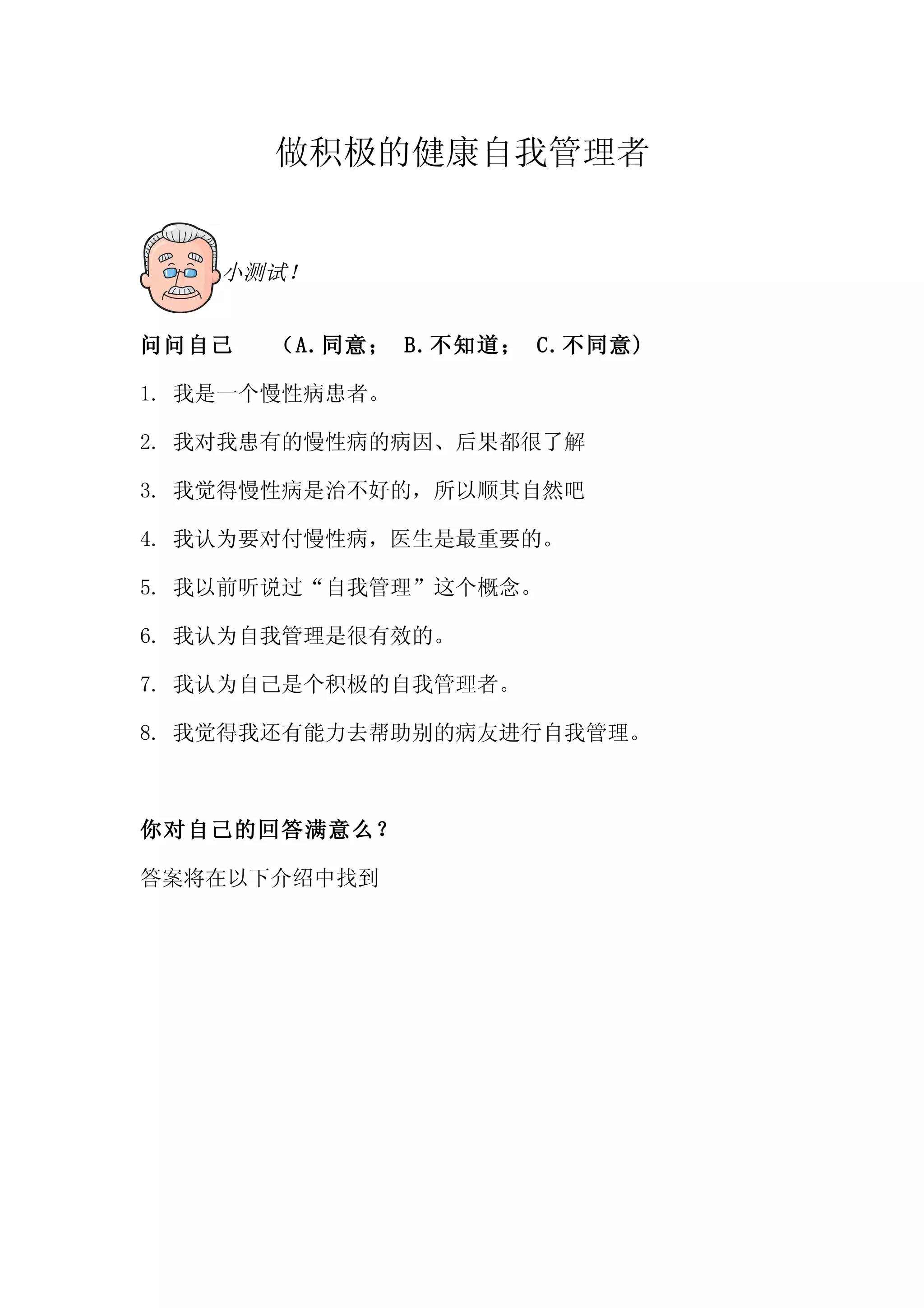 本文讨论了慢性病自我管理的重要性和步骤,包括如何明确目标、制定计划、执行计划、检查成效和奖励自己。积极的自我管理可以帮助患者控制病情、提高生活质量并影响他人。有效的自我管理不仅涉及医学治疗,还包括日常生活的各个方面。