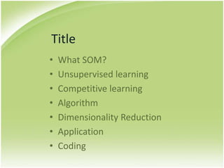 The document provides an overview of self-organizing maps (SOM). It defines SOM as an unsupervised learning technique that reduces the dimensions of data through the use of self-organizing neural networks. SOM is based on competitive learning where the closest neural network unit to the input vector (the best matching unit or BMU) is identified and adjusted along with neighboring units. The algorithm involves initializing weight vectors, presenting input vectors, identifying the BMU, and updating weights of the BMU and neighboring units. SOM can be used for applications like dimensionality reduction, clustering, and visualization.