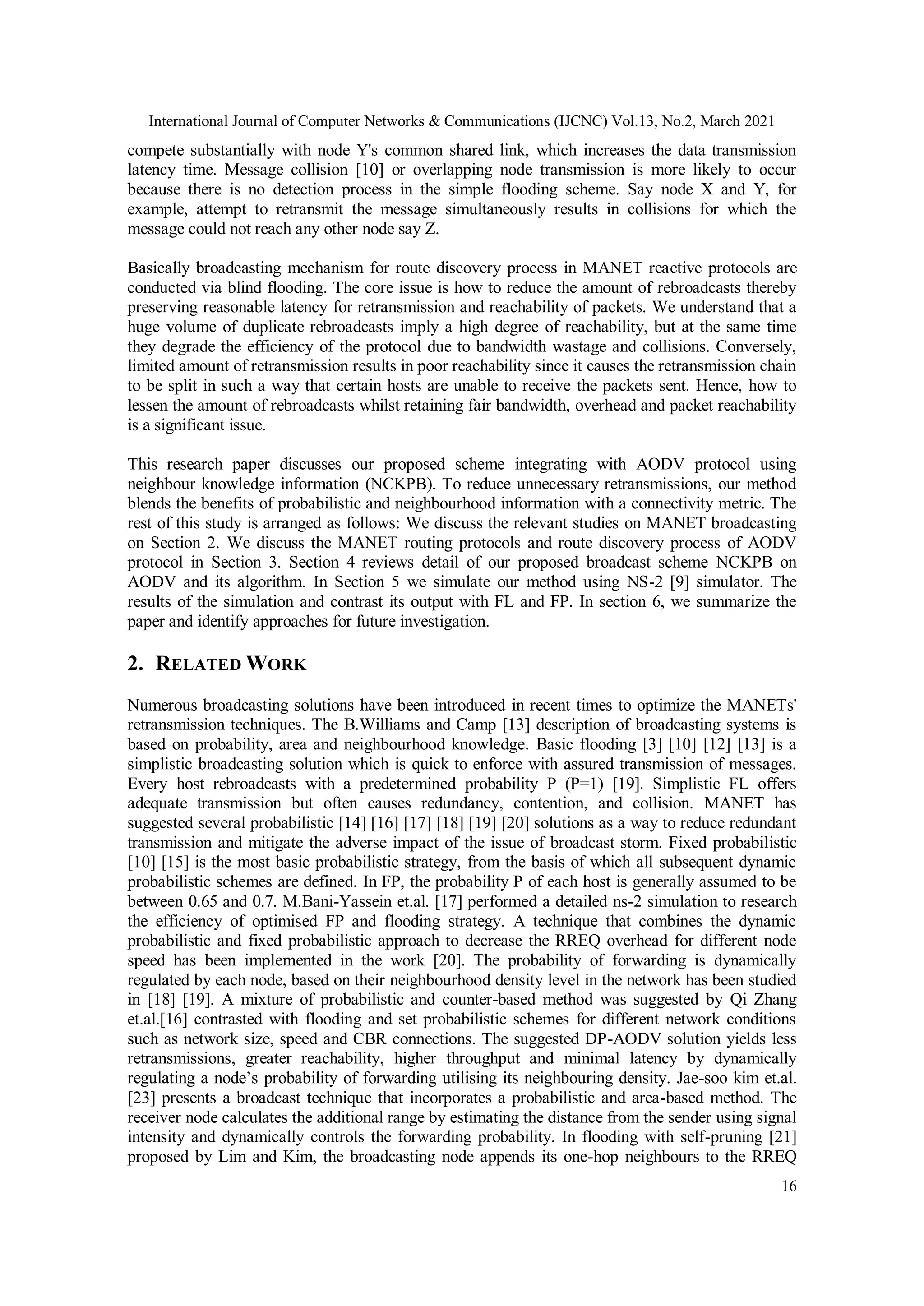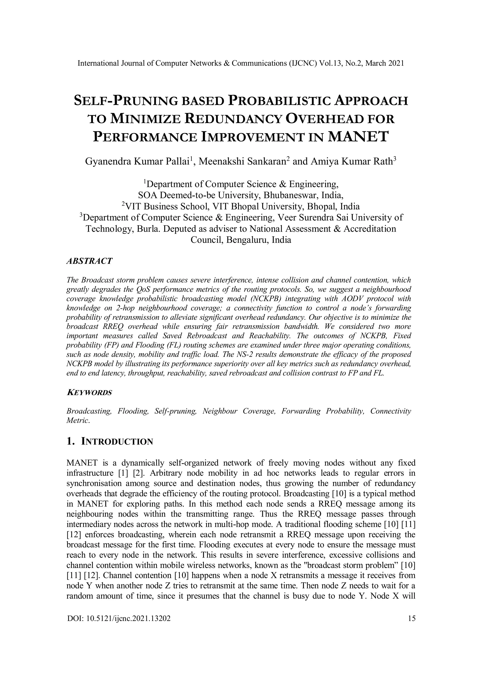 This document presents the Neighbourhood Coverage Knowledge Probabilistic Broadcasting Model (NCKPB) integrated with the AODV protocol to improve performance in Mobile Ad Hoc Networks (MANETs) by reducing redundancy overhead. The study addresses the broadcast storm problem which leads to increased collisions, channel contention, and lower quality of service. Simulation results demonstrate that the NCKPB model outperforms fixed probability and flooding schemes across key performance metrics such as end-to-end latency and throughput.
