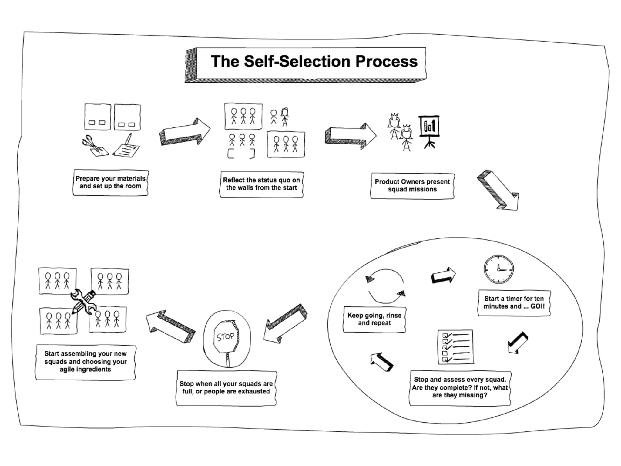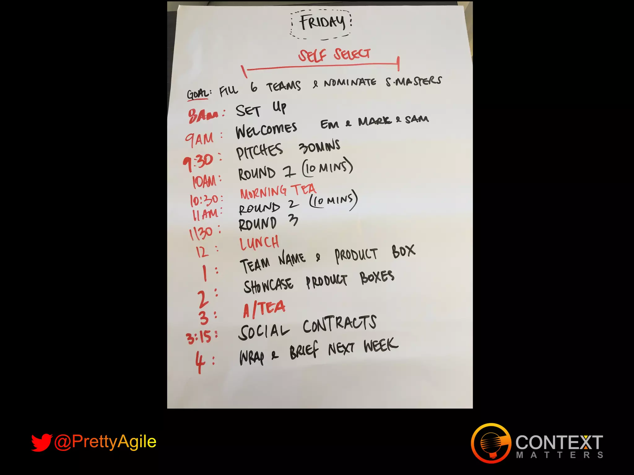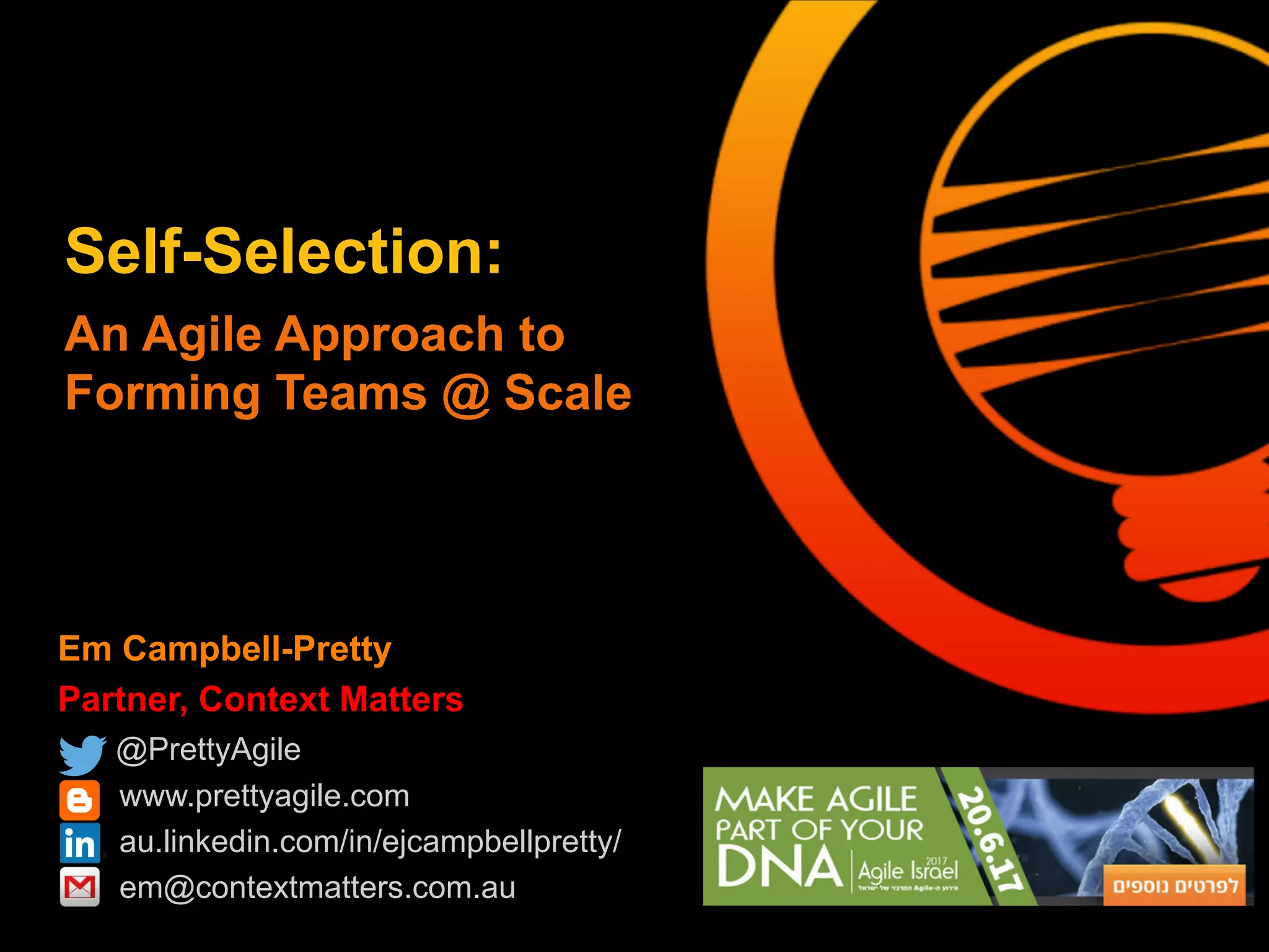 This document summarizes Em Campbell-Pretty's experience facilitating a self-selection process to form agile teams at scale. The process involved defining constraints, answering FAQs, and conducting selection in rounds. Lessons learned include being clear on expectations, not seeding teams, and communicating effectively. The result was teams formed in only 3 rounds without management intervention.