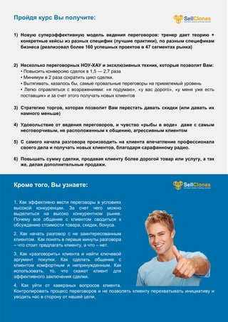 Документ представляет уникальный курс по продажам, направленный на переход от модели «push» к модели «pull», что позволяет продавцам убирать ценовую конкуренцию и повышать эффективность переговоров. Участники курса получат навыки для работы с возражениями клиентов, улучшения конверсии сделок и стратегии повышения суммы сделки. Программа включает практические кейсы и методики для успешного ведения переговоров в условиях высокой конкуренции.