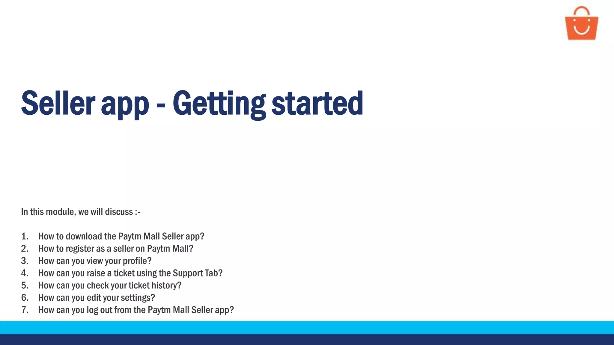 The document provides instructions for downloading the Paytm Mall Seller app, registering as a seller, viewing profiles, raising support tickets, checking ticket history, editing settings, and logging out. It describes the 6 step process for downloading the app and the steps for registering including linking an existing Paytm.com account or creating a new one and filling out personal, business, financial, and warehouse details. It also explains how to view profiles, submit support tickets, check past tickets, change settings like notifications and language, and logout of the app.