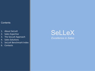 SeLLeX is a Bulgarian sales performance consulting and training company. It aims to help clients improve sales processes and bottom lines through solutions like sales training, workshops, consultancy, coaching and assessments. SeLLeX has experience across industries and focuses on improving sales productivity, managing talent, and transitioning to more solution-based selling. It believes stakeholder engagement is key to successful consulting projects.