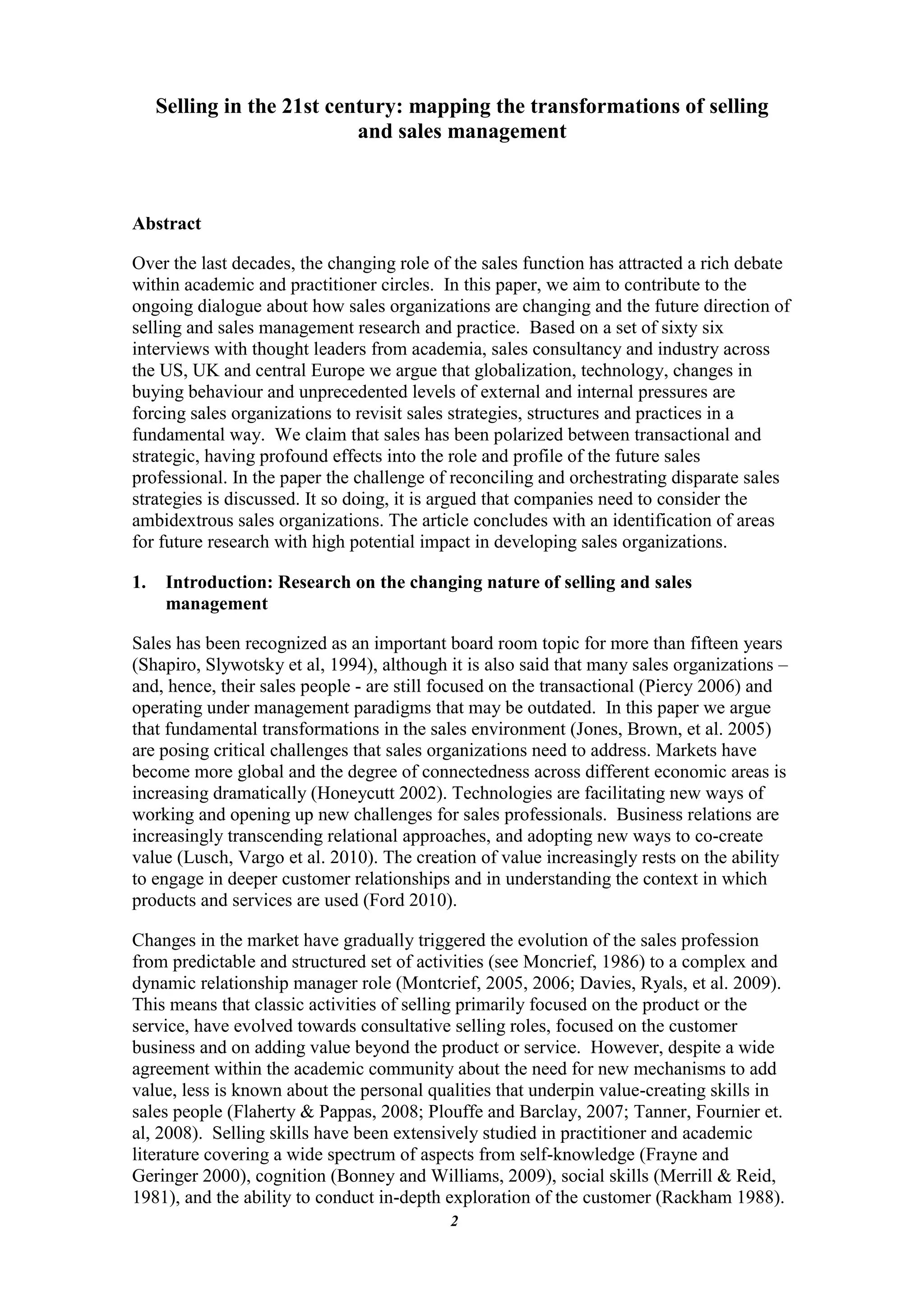 The paper discusses the transformations in selling and sales management due to globalization, technology, and changing buyer behavior, highlighting the shift from transactional to strategic sales roles. Based on interviews with 66 experts, it emphasizes the need for sales organizations to adapt their strategies and structures to remain competitive. The authors call for further research to explore the competencies required for sales professionals in this evolving landscape.