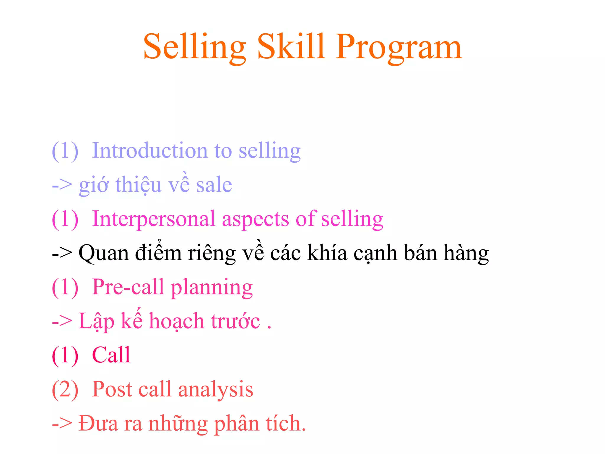 Chương trình kỹ năng bán hàng tập trung vào việc giới thiệu về bán hàng, các khía cạnh con người trong bán hàng và lập kế hoạch trước cuộc gọi để đạt được kết quả tốt. Nó nhấn mạnh tầm quan trọng của việc hiểu khách hàng và sản phẩm để tạo ra doanh số mà còn phác thảo các phong cách tính cách khác nhau trong giao tiếp bán hàng. Cuối cùng, tài liệu trình bày quy trình từ việc mở cuộc gọi, tìm hiểu nhu cầu, thuyết trình, xử lý phản đối đến việc kết thúc giao dịch.