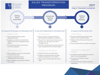The document focuses on essential selling skills, emphasizing effective presentation techniques that consider both the presenter’s and audience's perspectives. It outlines strategies for successful networking before, during, and after events, including goal setting and relationship building. Additionally, it addresses common challenges like nervousness and offers tips for networking, such as being approachable and demonstrating value.