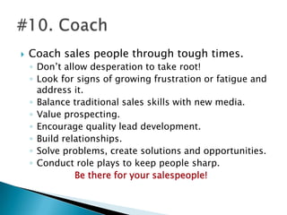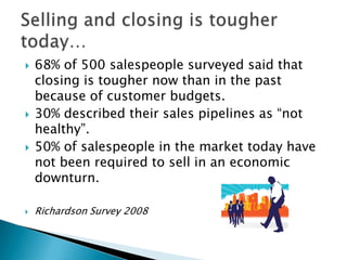 This document provides 10 key strategies and tactics for improving booking pace, even in difficult market environments. It recommends focusing on sales expertise, clearly defining your offering, implementing integrated marketing, improving outreach methods like cold calls, prioritizing quality lead generation activities, listening to customers, building relationships, preparing for objections, coaching sales teams, and celebrating successes. The overall message is that a combination of leadership, people skills, strategic planning, tools, and training can help deliver results.
