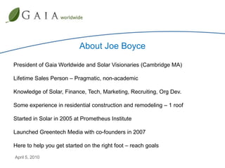 The document provides an overview of the solar industry and advice for entering the solar business. It summarizes that the global solar market has grown significantly in recent years. It then provides tips on establishing validity and thought leadership to build a brand in the solar industry locally. This includes sharing industry knowledge, partnering with local businesses, and keeping marketing messages clear and consistent.