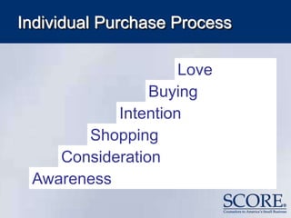 This document provides tips and techniques for effective selling. It discusses understanding the customer's individual purchase process and needs. Key aspects of the sales process include preparing by researching the customer and product, presenting the value proposition to solve the customer's needs, handling objections, negotiating, and following up. Important elements are listening to the customer, controlling the flow of the presentation, asking for the order, and providing excellent customer service after the sale. Common mistakes include not listening, not asking for the order, and neglecting existing customers.